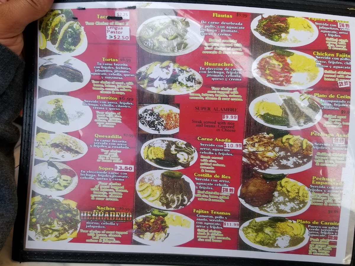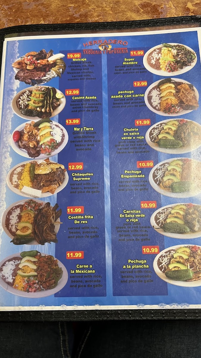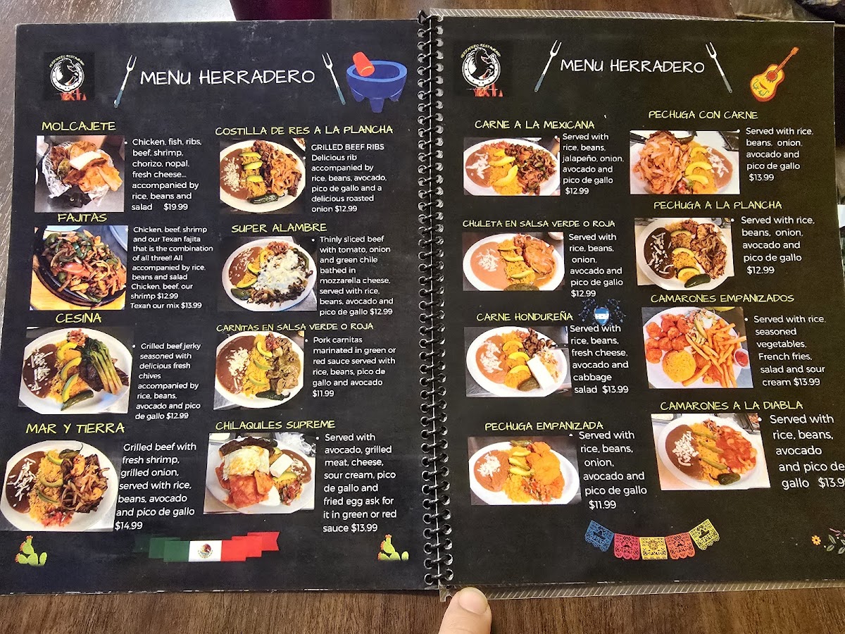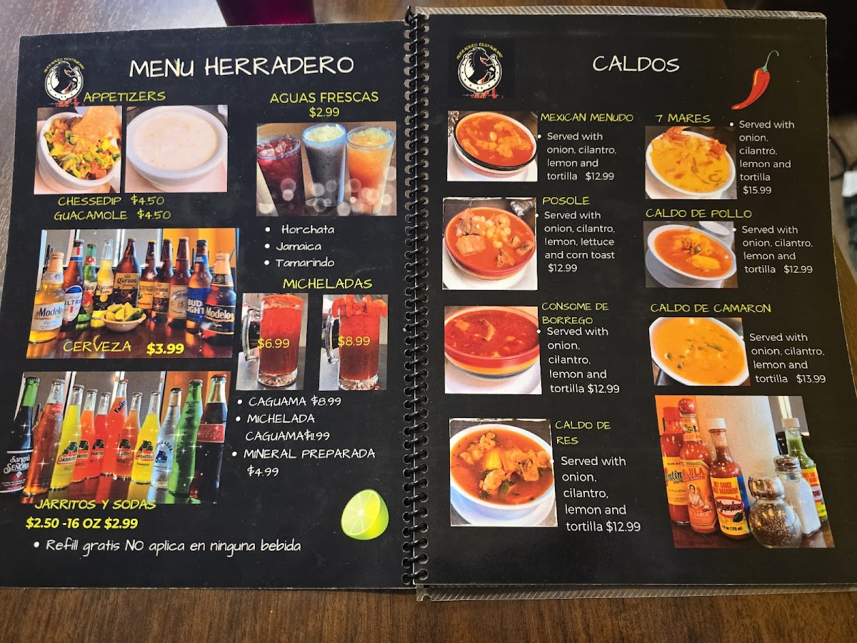 For those craving a more substantial meal, Herradero Taqueria’s Item-Menu offers a variety of savory dishes. The Sopa De Camarones (shrimp soup) is a flavorful, hearty option for seafood lovers, while the Molcajete serves a sizzling, traditional stone bowl filled with meats and vegetables, delivering a rich, smoky taste. The Tacos Chilaquiles Supreme are a standout, with crispy tortilla chips topped with savory chilaquiles and a mix of meats, perfect for anyone looking for a satisfying and flavorful bite. Another tempting dish is the Pechuga Azada Con Carne (grilled chicken breast with beef), a combination that offers a delicious mix of textures and flavors that is sure to please.